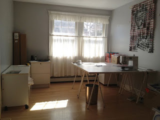 In January 2012, I spoke to some artist friends about their studio spaces, and about how I was thinking about moving my studio back home. Someone suggested I move a large bookcase/storage unit out of the room for my home studio, into the room with my computer. That's when I started to see how I could make better use of space.